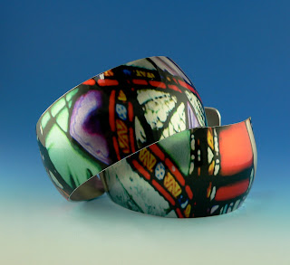 And indeed it, I think it does! The richness of the reds, blues and greens contrast so nicely with the silver of the aluminum and the black. It is just rich! You can see the saint with a bird here in this bangle (- maybe my dad knows the background to the window and who this is?):